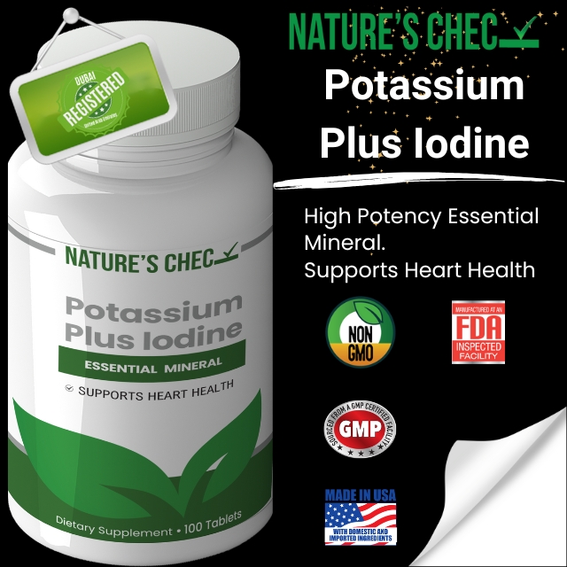 Potassium Plus Iodine Promotes Energy, Electrolyte Balance, and Thyroid Function. Popular in Dubai, It Supports Overall Vitality and Cellular Health. Trust Nature’s Chec for Top-Quality Supplements in the UAE.