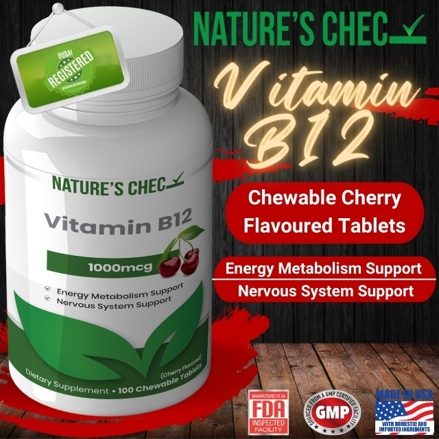 Vitamin B12 Supports Energy Production, Brain Health and Nerve Function. A Favorite in Dubai, It’s Vital for Overall Wellness. Choose Nature’s Chec for High-Quality B12 Supplements in the UAE.