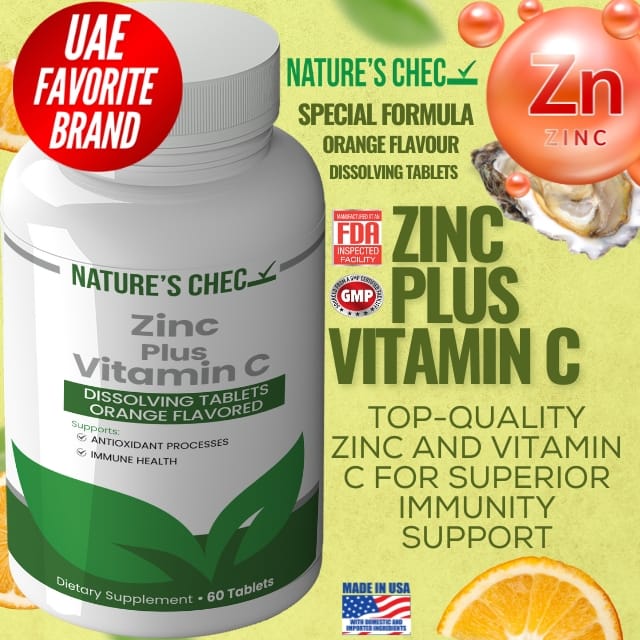Zinc Plus Vitamin C Boosts Immune Defence, Supports Skin Health, And Promotes Recovery. A Dubai Bestseller, It’s Essential for Daily Wellness. Choose Nature’s Chec for Effective Immunity Care in the UAE.
